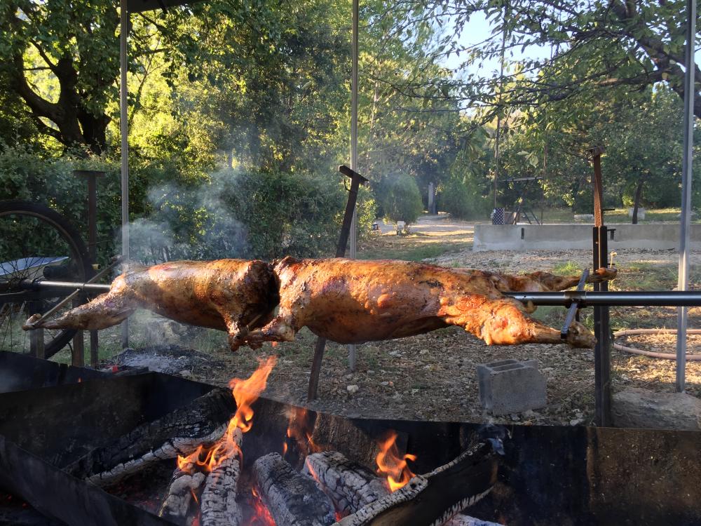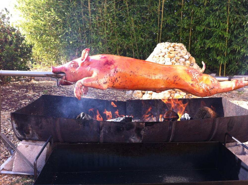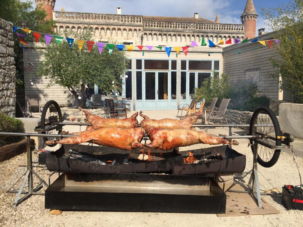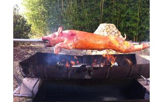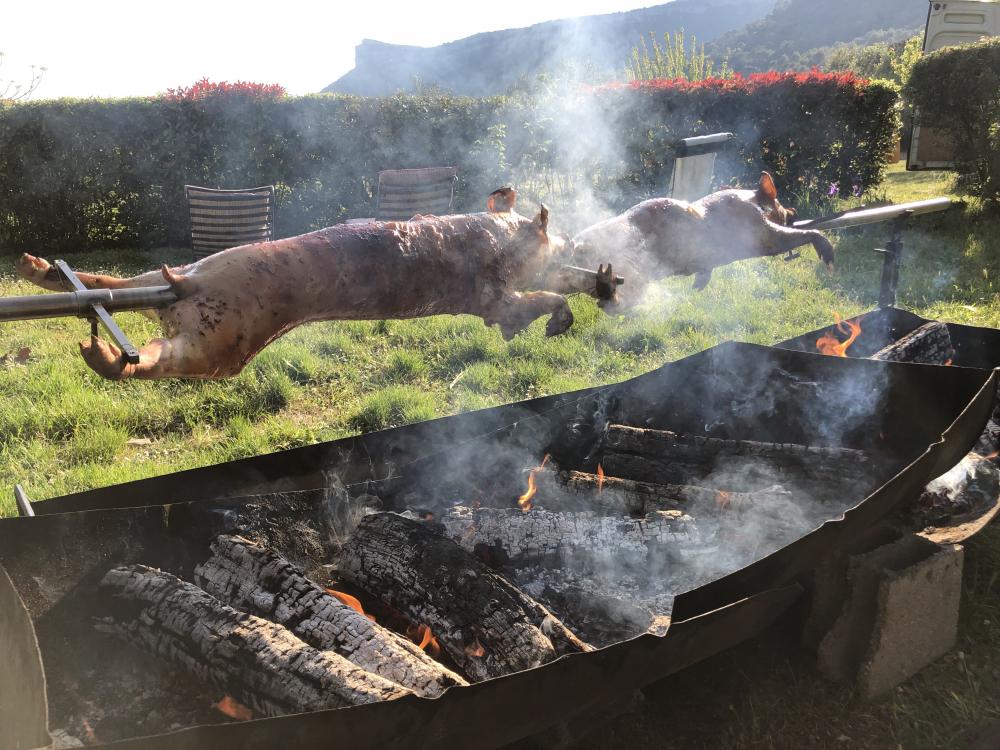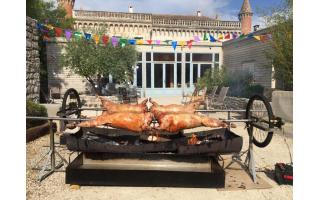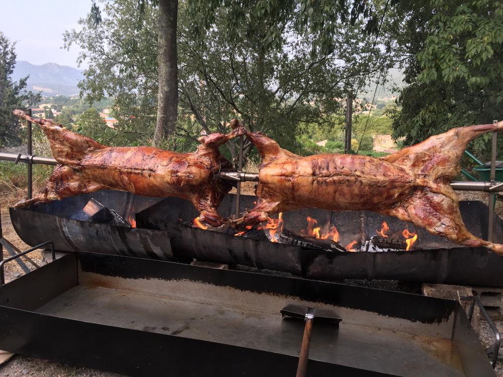 Agneau à la broche (option label rouge), Porcelet à la broche, Magret de canard.