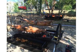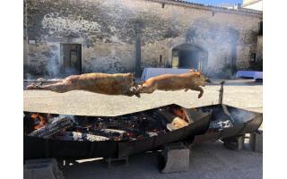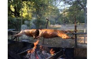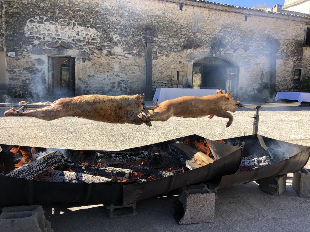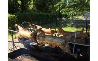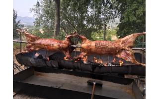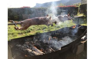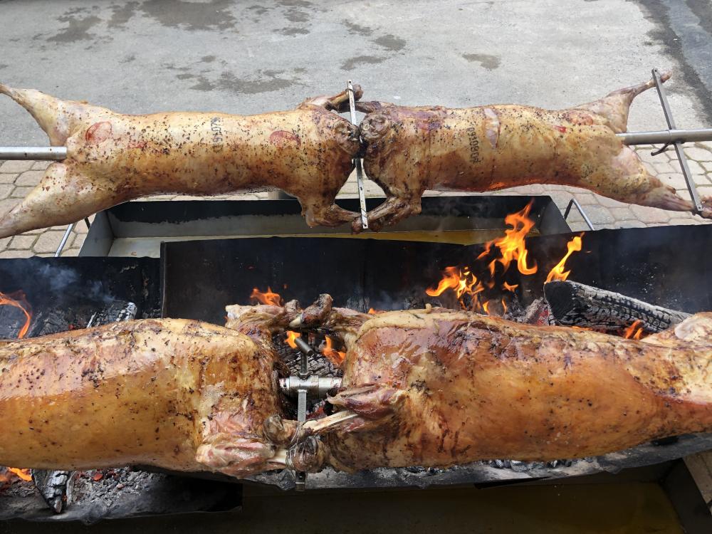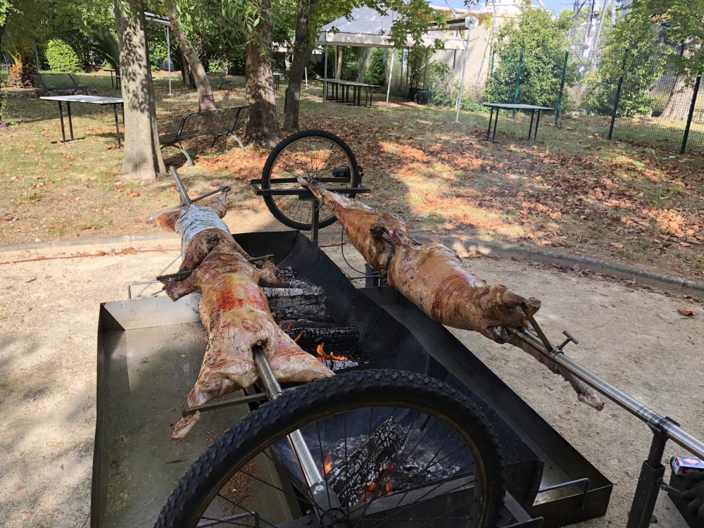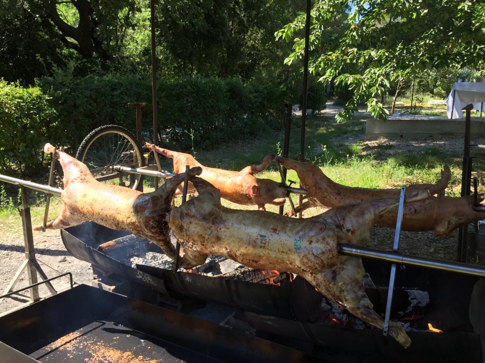Agneau à la broche (option label rouge), Porcelet à la broche, Magret de canard.